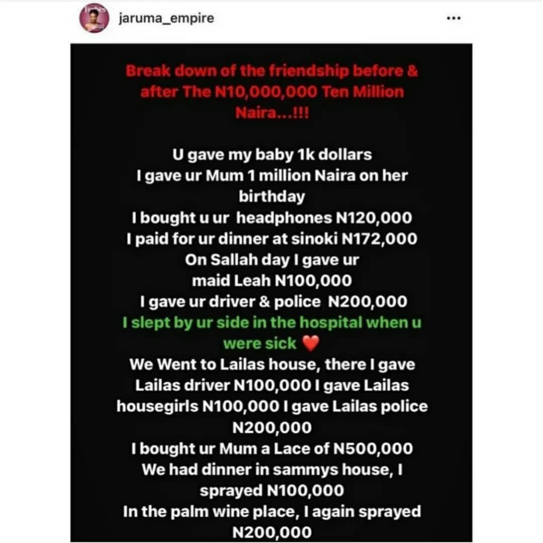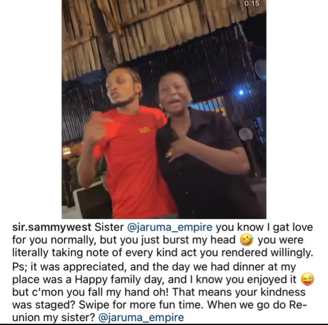 Destiny wrote On his part, Sammy stated that Jaruma’s kindness was staged. ”Sister @jaruma_empire you know I gat love for you normally, but you just burst my head you were literally taking note of every kind act you rendered willingly.