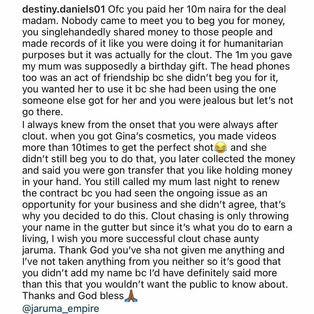 when you got Gina’s cosmetics, you made videos more than 10times to get the perfect shot and she didn’t still beg you to do that, you later collected the money and said you were gon transfer that you like holding money in your hand.You still called my mum last night to renew the contract bc you had seen the ongoing issue as an opportunity for your business and she didn’t agree, that’s why you decided to do this.Clout chasing is only throwing your name in the gutter but since it’s what you do to earn a living, I wish you more successful clout chase aunty jaruma. Thank God you’ve sha not given me anything and I’ve not taken anything from you neither so it’s good that you didn’t add my name bc I’d have definitely said more than this that you wouldn’t want the public to know about. Thanks and God bless@jaruma_empire”