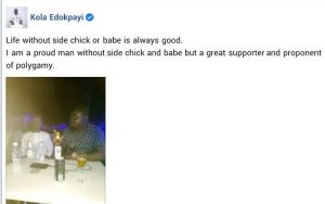 “Life without side chick or babe is always good. I am a proud man without side chick and babe but a great supporter and proponent of polygamy,” he wrote.