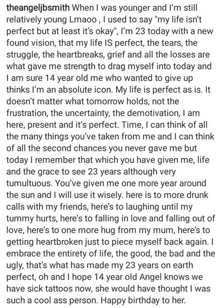 I embrace the entirety of life, the good, the bad and the ugly, that’s what has made my 23 years on earth perfect, oh and I hope 14 year old Angel knows we have sick tattoos now, she would have thought I was such a cool ass person. Happy birthday to her.”