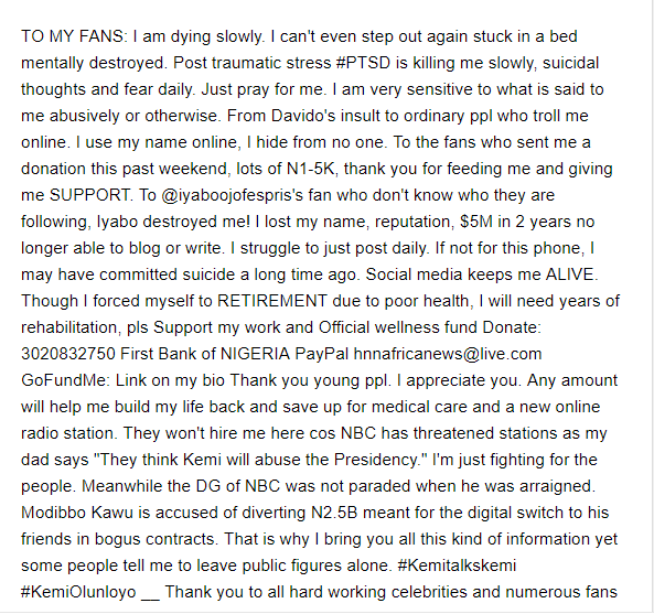 Controversial journalist, Kemi Olunloyo is crying out to Nigerians for support of her work and official wellness fund.