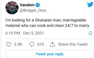 ‘I’m looking for a Ghanaian man, marriageable material who can cook and clean 24/7 to marry.”