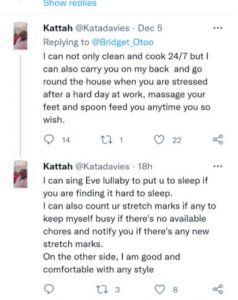 She took to Twitter to disclose that she doesn’t know how to cook therefore she would be willing to give any man a chance should he accept her proposal of cleaning and cooking 24/7.