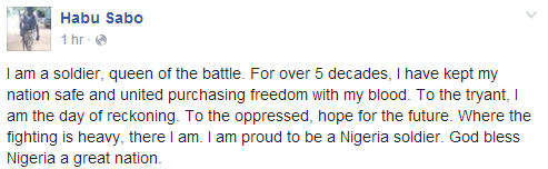 Habu Sabo, one of the troops fighting Boko Haram in the North East, took to his Facebook page to say how proud he is to be a Nigerian soldier.