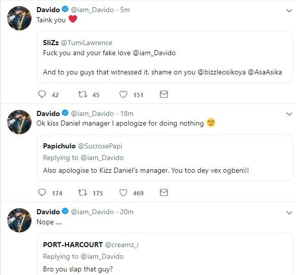 Finally, Davido has reacted to allegations that he slapped Kizz Daniel’s manager, Tumi Lawrence at his concert last night.