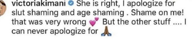 However reacting to the backlash she faced, Victoria Kimani who apologized for slut-shaming Tiwa Savage however added that she is not sorry for other things she said.
