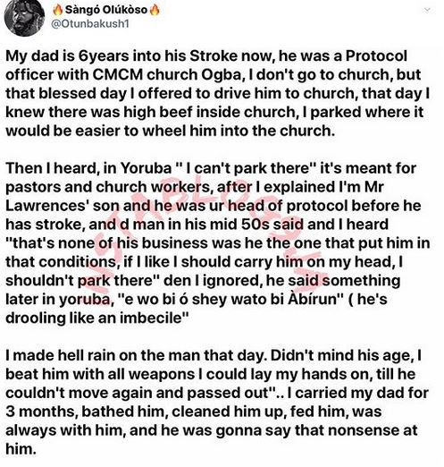 A Nigerian man has narrated how he physically attacked a church official for making a snide comment about his father who had stroke.