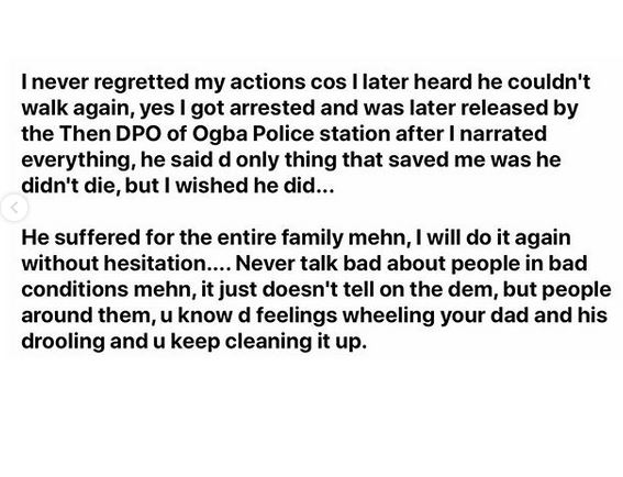 I never regretted my actions cos I later heard he couldn’t walk again, yes I got arrested and was later released by the Then DPO of Ogba Police station after I narrated everything, he said d only thing that saved me was he didn’t die, but I wished he did…