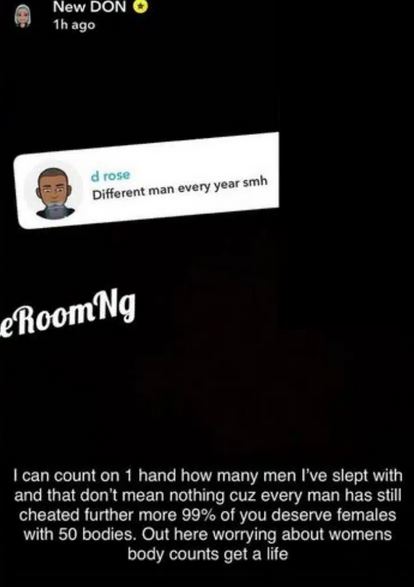 “I can count on 1 hand how many men I’ve slept with and that don’t mean nothing cuz every man has still cheated further more 99% of you deserve females with 50 bodies. Out here worrying about womens body counts get a life “