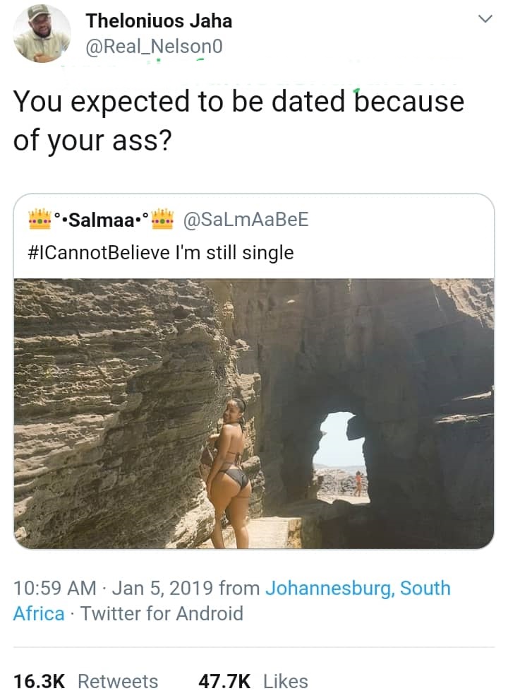 Then this man, Theloniuos Jaha @Real_Nelson0 gave her this reply which people consider to be epic.