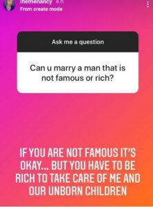 When asked if she can marry a man who isn’t rich or famous, she said doesn’t need a famous man but a man has to be rich for her to marry him.