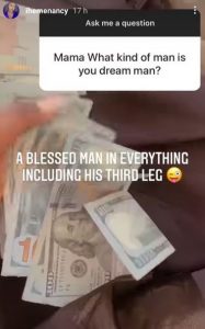 As for what she wants in a man, she shared a video of someone displaying wads of dollar notes and explained that her dream man has to be “a blessed man in everything including his third leg.”