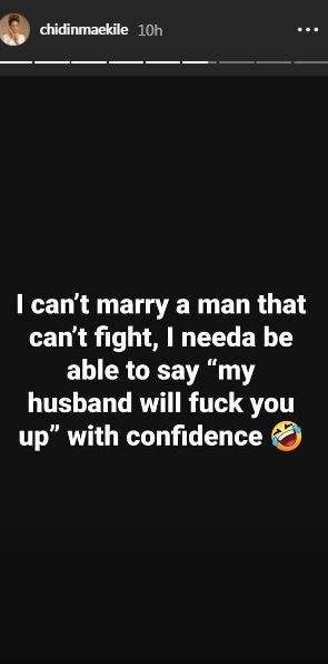 “I can’t marry a man that can’t fight, I needa be able to say “my husband will fuck you up” with confidence,” she wrote.