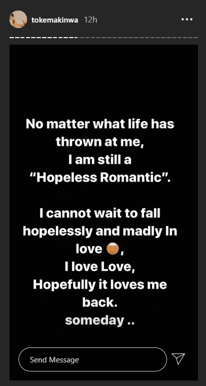Media personality, Toke Makinwa has opened up on her new relationship goal as she writes about love.