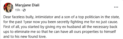 “Dear faceless bully, intimidator and a son of a top politician in the state, for the past 1 year now you have been secretly fighting me for no just cause. First of all, you started by giving my ex husband all the necessary back ups to eliminate me so that he can have all our properties to himself and to his new found love,” she wrote.