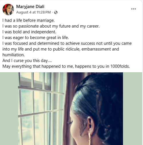 “I had a life before marriage. I was so passionate about my future and my career. I was bold and independent. I was eager to become great in life. I was focused and determined to achieve success not until you came into my life and put me to public ridicule, embarrassment and humiliation. And I curse you this day. May everything that happened to me, happens to you in 1000folds.”