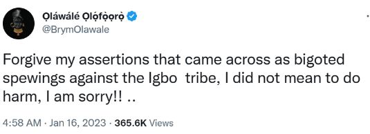 The singer tweeted; Forgive my assertions that came across as bigoted spewings against the Igbo tribe, I did not mean to do harm, I am sorry!!