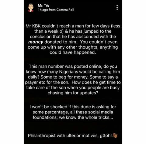 According to Kokun Foundation CEO who aided in raising N70m for the man in days, he took to his insta story alleging the man absconded with the money when several means tried to contact the man failed.