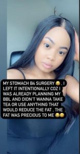The reality show star disclosed that she didn’t take tea or anything that will reduce the fat in her stomach because it was precious to her.