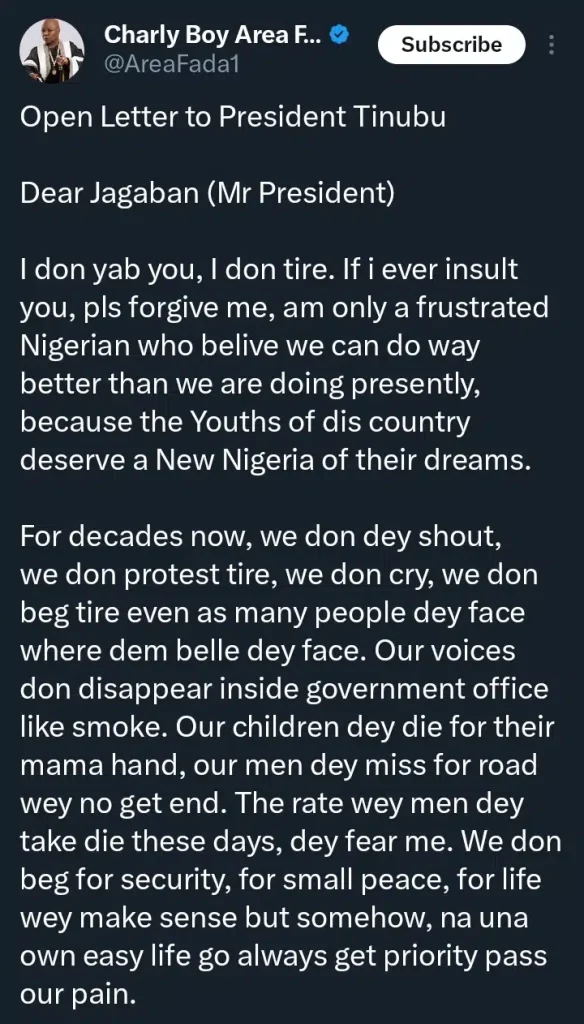 Nigerian entertainer and activist, Charles Oputa, popularly known as Charly Boy, has written an open letter to President Bola Ahmed Tinubu, expressing frustration over the worsening state of the nation.