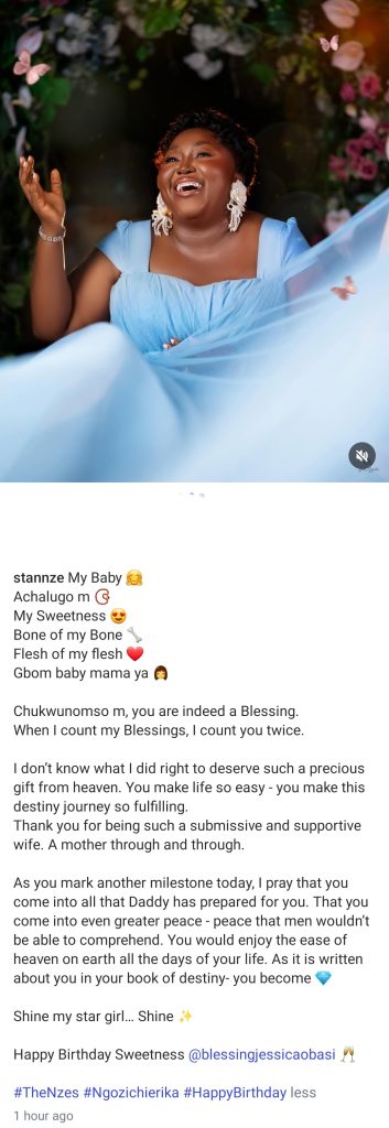 Actor Stan Nze dedicated an Instagram post to celebrate his wife Jessica Obasi on her birthday. The actor called his wife various endearing names and referred to her as a precious gift from heaven. See below.