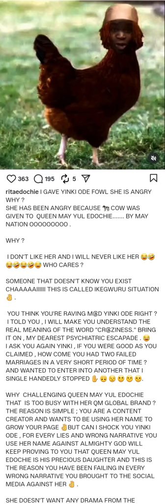 In a new post, Rita has now blasted Yinka for continuing to call out May and the Edochie family after her relationship with Linc did not work. Rita further stated ways May is better than Yinka as she called Yinka names.