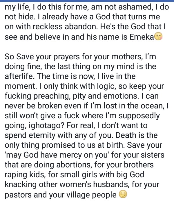 So Save your prayers for your mothers, I’m doing fine, the last thing on my mind is the afterlife. The time is now, I live in the moment. I only think with logic, so keep your bleeping preaching, pity and emotions. I can never be broken even if I’m lost in the ocean, I still won’t give a Bleep where I’m supposedly going, ighotago? For real, I don’t want to spend eternity with any of you. Death is the only thing promised to us at birth. Save your ‘may God have mercy on you’ for your sisters that are doing abortions, for your brothers raping kids, for small girls with big God knacking other women’s husbands, for your pastors and your village people