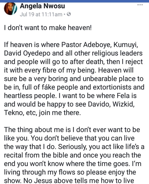 A Nigerian lady,Angela Nwosu, known for her outspokenness took to Facebook to say that she does not want to make if it is where the likes of Adeboye, Kumuyi, Oyedepo and others will go to after death.