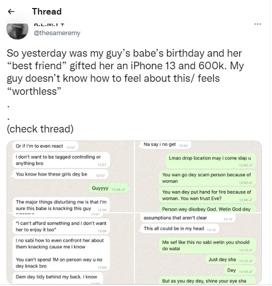 In the conversation, the man who didn’t know how to confront his woman about receiving such lavish gifts from her best friend said he is convinced they are more than just friends.
