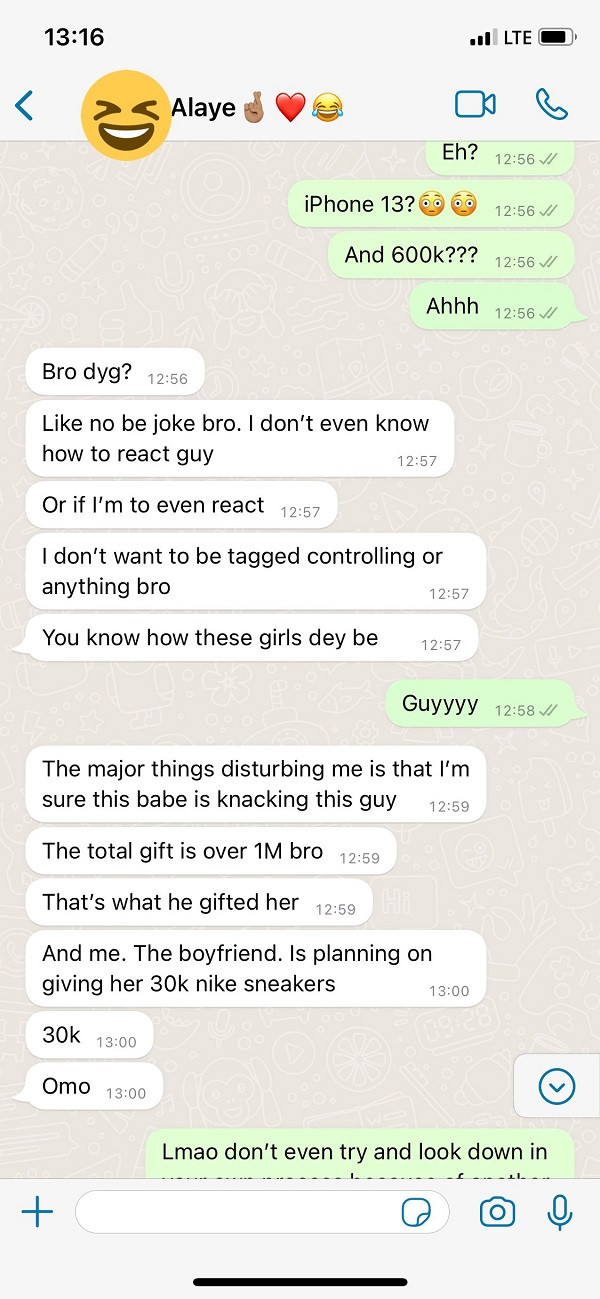 A Nigerian man has expressed disappointment with himself and life after his girlfriend’s male bestie gave her iPhone 13 and 600k as a birthday gift.