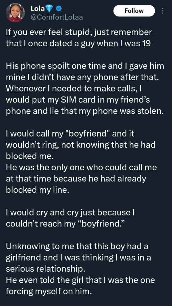 A Nigerian lady has sparked intense reactions online after sharing a painful story about a relationship she had at 19, exposing deception, manipulation, and emotional abuse.