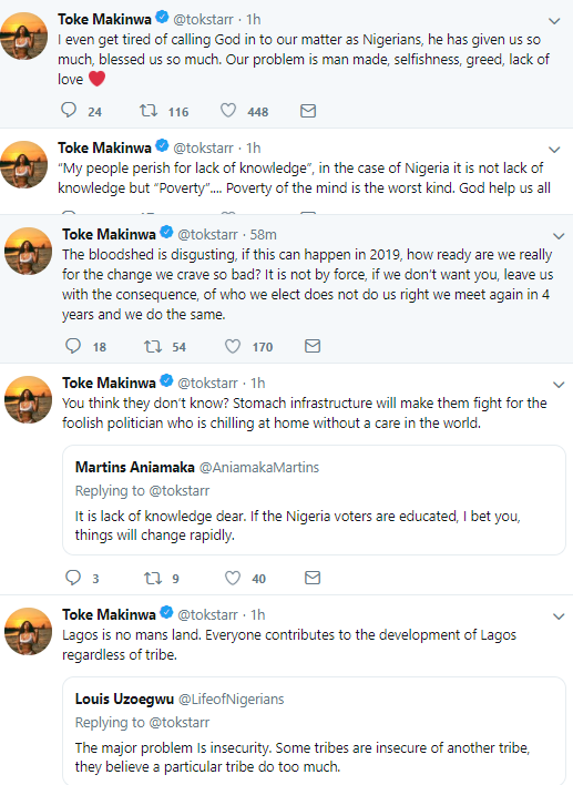 According to her, she is even getting tired of praying to God about Nigeria and all her problems. She also added that Lagos is no mans land as every tribe contributes to development of the mega city. Read her tweets from bottom to top below.