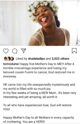 She wrote: “Happy first Mother’s Day to ME!!! After 4 horrible miscarriage experience and losing my beloved cousin Funmi to cancer, God restored me in everyway.