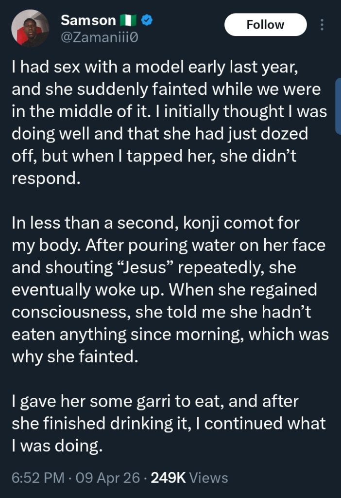 A Nigerian man has stirred widespread reactions online after sharing a startling experience involving a model during an intimate encounter.