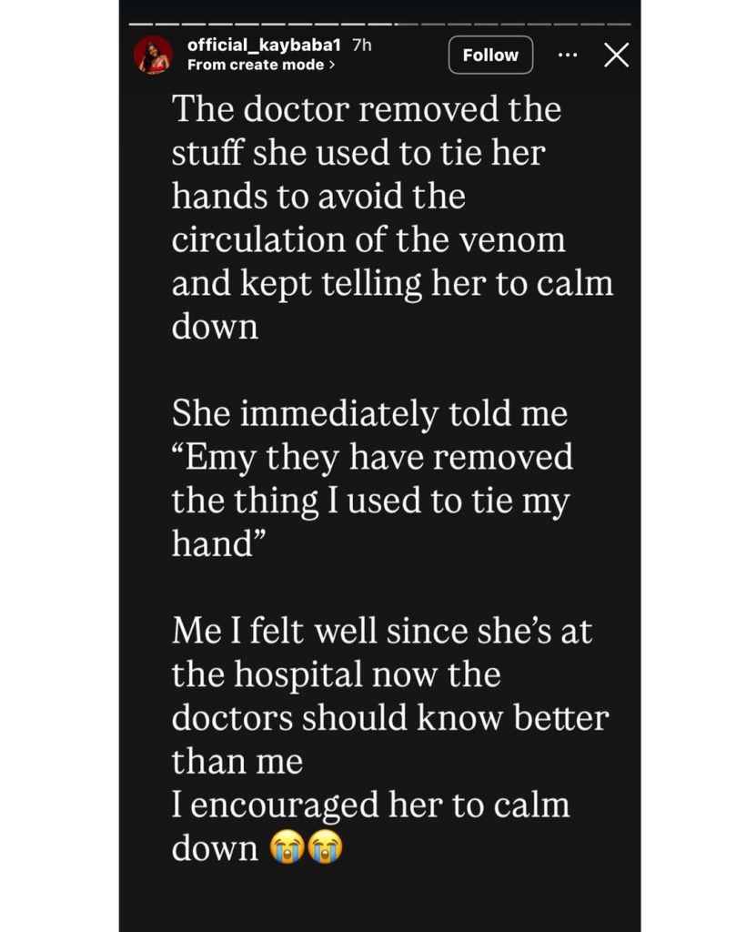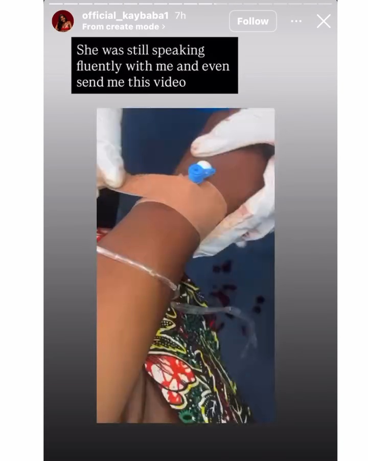 Emy Kaybaba said he was on the phone with her and she told him the hospital staff had untied the tourniquet and was giving her drip. When she complained about the removal of the torniquet, they asked her to calm down.
