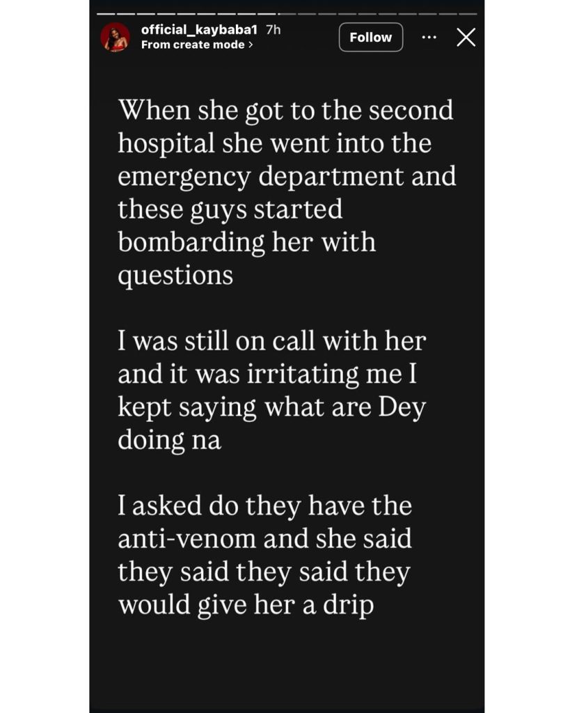 The first hospital in Lugbe, Abuja, said they didn’t have anti-venom so she went to another hospital where they untied the tourniquet, not minding Nanyah’s protest