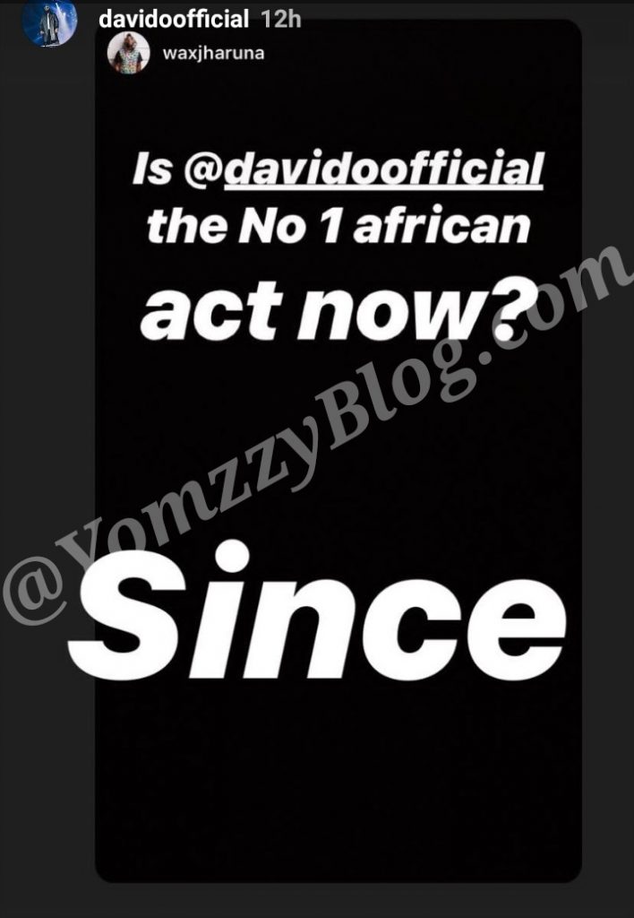 A fan of award-winning Nigerian singer, Davido took to his social media space to ask If he is Africa’s number one artist, the singer replied ‘Since’.