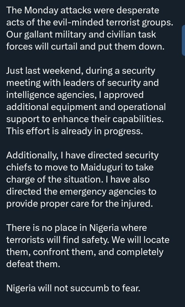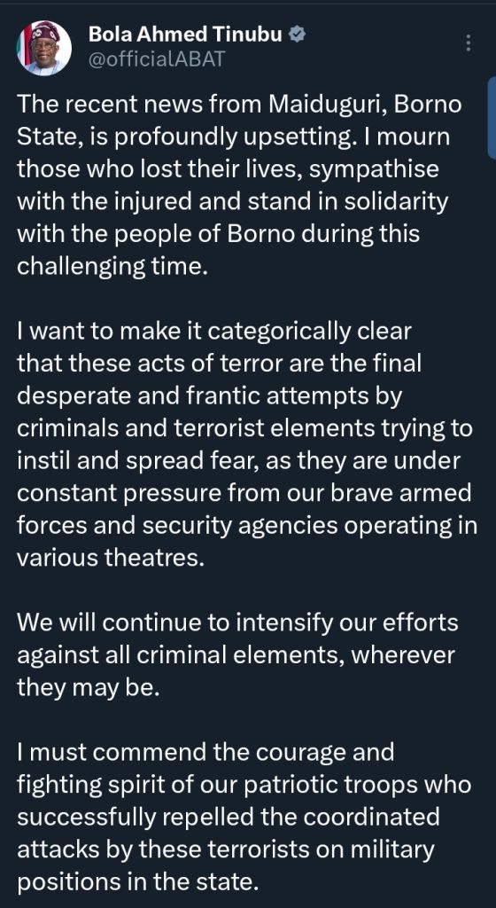 President Bola Ahmed Tinubu has expressed deep sorrow over the recent attacks in Maiduguri, describing the incident as heartbreaking and unacceptable.