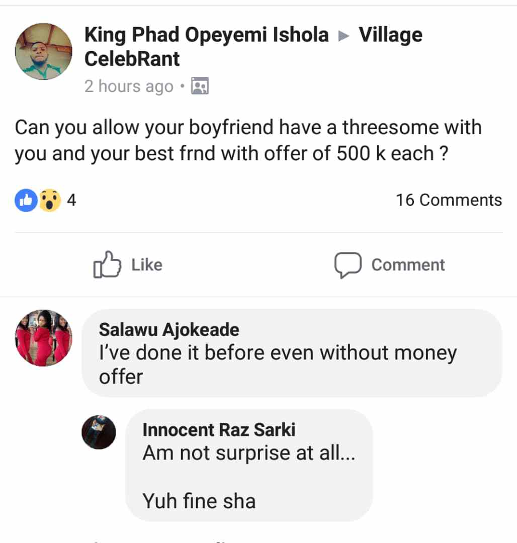 This come to light when a young man identified as King Phad via a facebook group past asked ladies if they can allow their boyfriend have a threesome with her best friend for #500k.