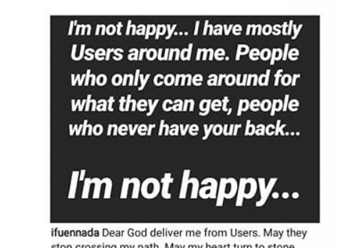 The reality show star stated that these “users” never have her back and also prayed for her heart to be turned to stone when next they come around. Ifu Ennada wrote;