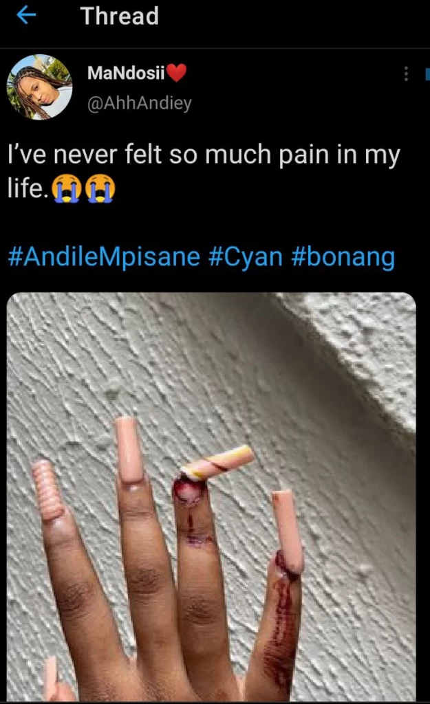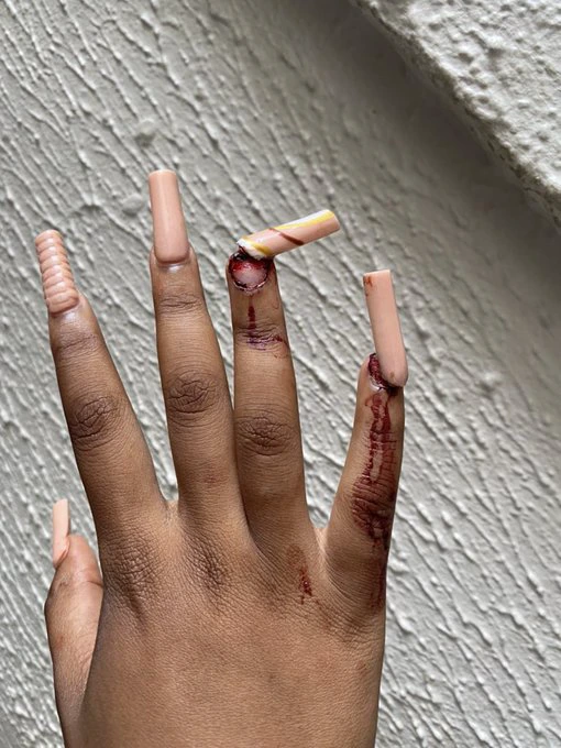 Our women feel that being beautiful comes with body modification. Well a young lady shared an image of what happened to her trying to lift heavy equipment around her house. What she did not notice was that accident will take place without a warning. Lady broke her nails as though she was in a fight.