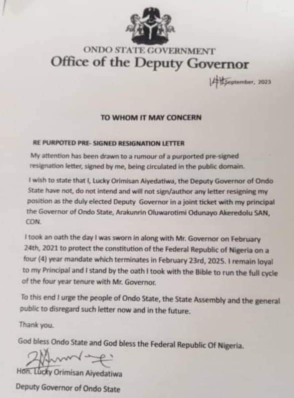 However, the deputy governor in a statement issued and personally signed by him in Akure, the state capital, denied a purported pre-signed resignation letter said to be circulating in the public domain.