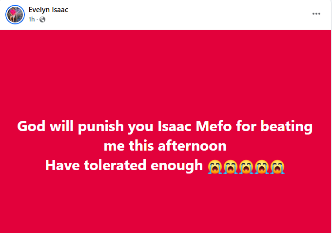 “God will punish you Isaac Mefo for beating me this afternoon. Have tolerated enough,” she wrote.