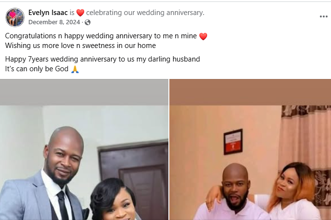 “Congratulations n happy wedding anniversary to me n mine. Wishing us more love n sweetness in our home. Happy 7years wedding anniversary to us my darling husband. It’s can only be God,” the message read.