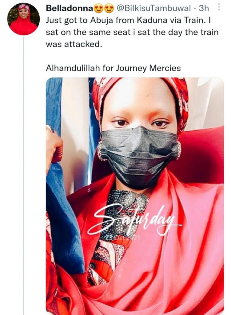 Belladonna @BilkisuTambuwal: “Just got to Abuja from Kaduna via Train. I sat on the same seat i sat the day the train was attacked.Alhamdulillah for Journey Mercies.”