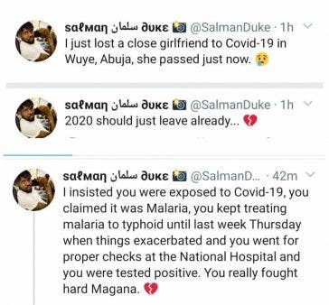 The Twitter user, @SalmanDuke said the deceased had been ill and was treating malaria and typhoid until last Thursday when she tested positive for the novel Coronavirus.