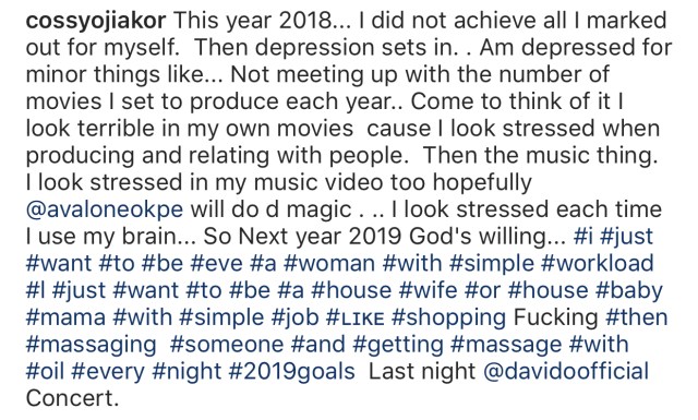 Nollywood actress, Cossy Ojiakor has revealed she was depressed this year and looked stressed in all her movies and even music videos. According to her, come 2019,her goals are to be a housewife or babymama with little workload and lots of shopping.