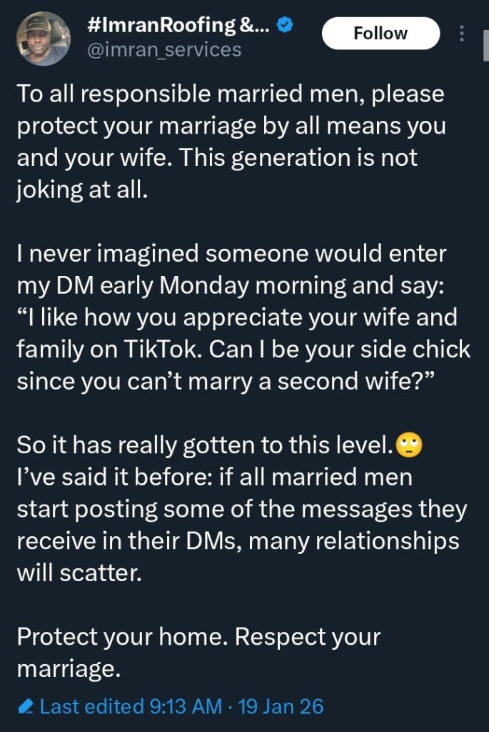 A social media post has stirred debate online after a married man revealed a private message he received from a woman on TikTok, raising concerns about boundaries and marriage respect.