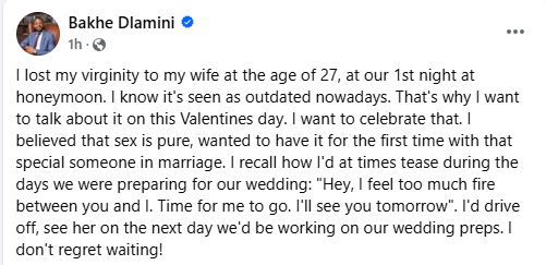 “I lost my virginity to my wife at the age of 27, at our 1st night at honeymoon. I know it’s seen as outdated nowadays. That’s why I want to talk about it on this Valentines day. I want to celebrate that. I believed that sex is pure, wanted to have it for the first time with that special someone in marriage,” he wrote.