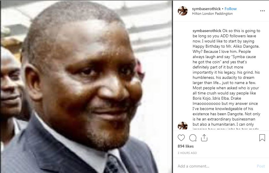 Curvy Instagram model, Symbas Erothick, shared a photo of Alhaji Aliko Dangote to wish him a happy birthday and she went on to disclose that he’s her crush.